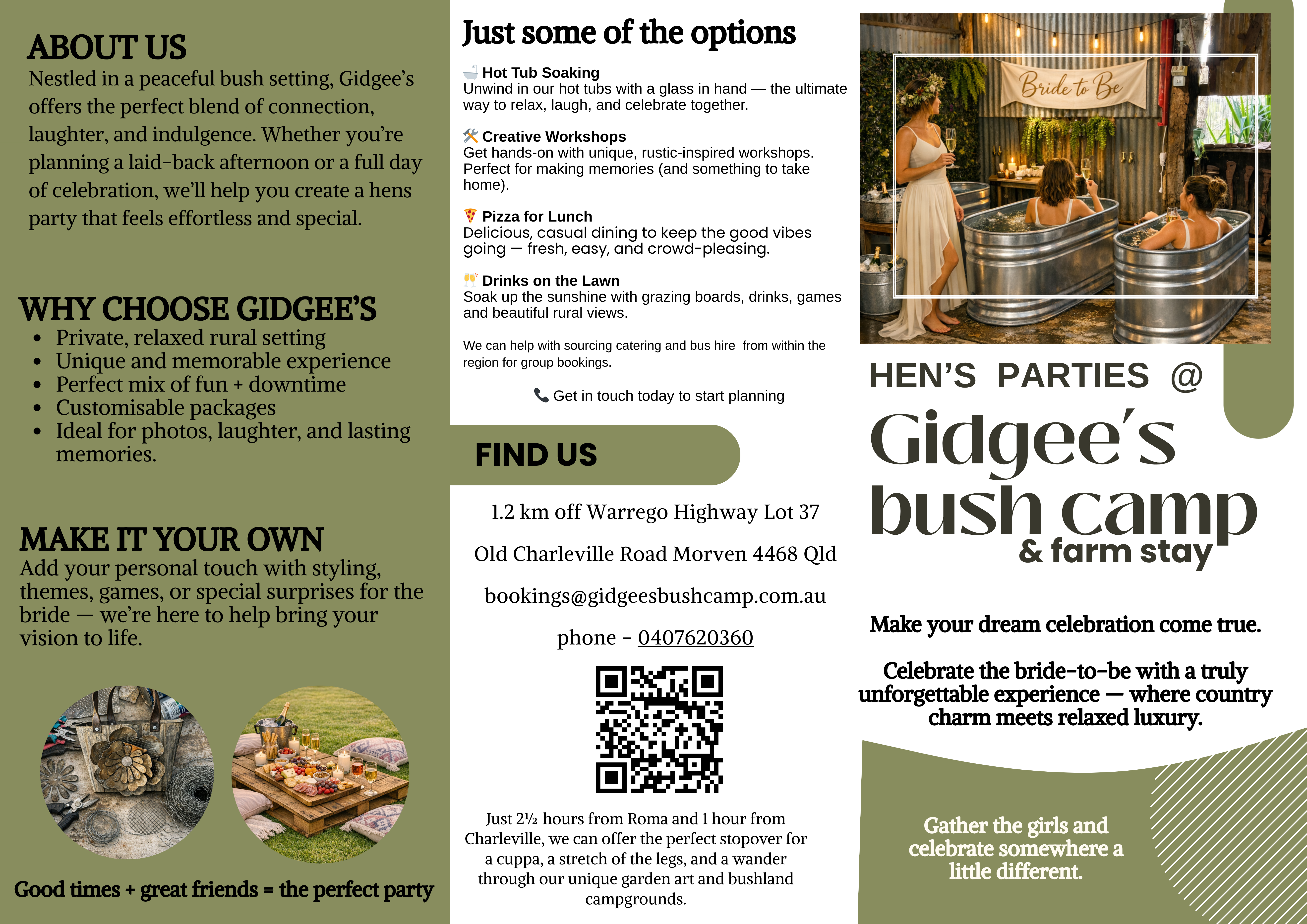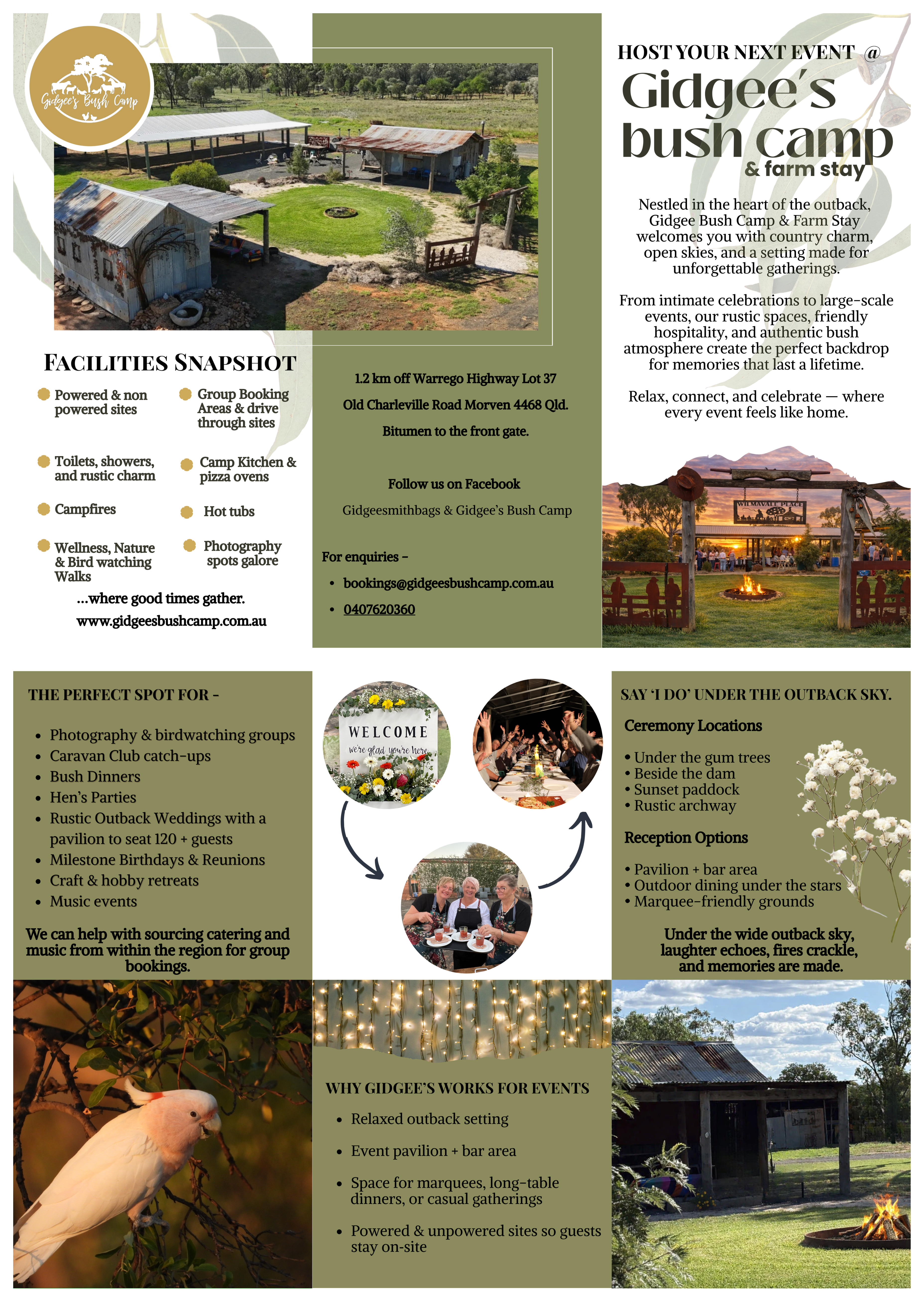 From intimate celebrations to large-scale events, our rustic spaces, friendly hospitality, and authentic bush atmosphere create the perfect backdrop for memories that last a lifetime.
